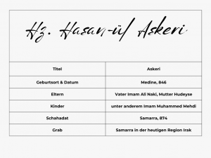Imam Hasan ül Askeri war der elfte Imam und lebte unter dauernder Kontrolle der abbasidischen Herrscher. Er musste in Samarra unter militärischer Aufsicht leben, weshalb er den Titel Askeri erhielt. Die Regierung versuchte, seinen Einfluss zu unterbinden, indem sie ihn isolierte und den Kontakt zu seinen Anhängern erschwerte. Trotzdem führte er das Imamet fort und sorgte dafür, dass das Wissen der Ahl i Beyt weitergegeben wurde.