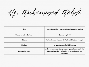 Imam Muhammed Mehdi ist der zwölfte Imam und wurde in einer Zeit geboren, in der die abbasidischen Herrscher versuchten, die Nachkommen der Ahl i Beyt auszulöschen. Seine Geburt wurde verborgen gehalten, damit er geschützt blieb. Nach dem Tod seines Vaters trat er das Imamet an, doch um sein Leben zu bewahren, blieb er verborgen. Damit endete die sichtbare Reihe der Imame, aber nicht ihre spirituelle Führung.