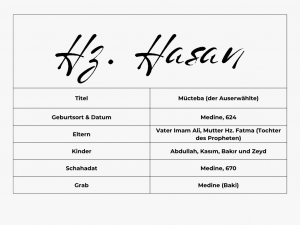 Imam Hasan war der älteste Sohn von Imam Ali und Hz. Fatma und damit der erste Enkel des Propheten Muhammad. Nach dem Tod seines Vaters übernahm er das Imamet. Der Prophet zeigte ihm große Liebe, spielte mit ihm und nannte ihn und seinen Bruder „meine Söhne“. Er war derjenige, auf den die Nachfolge Alis überging, wie es Imam Ali selbst in seinem Vermächtnis bestimmte.